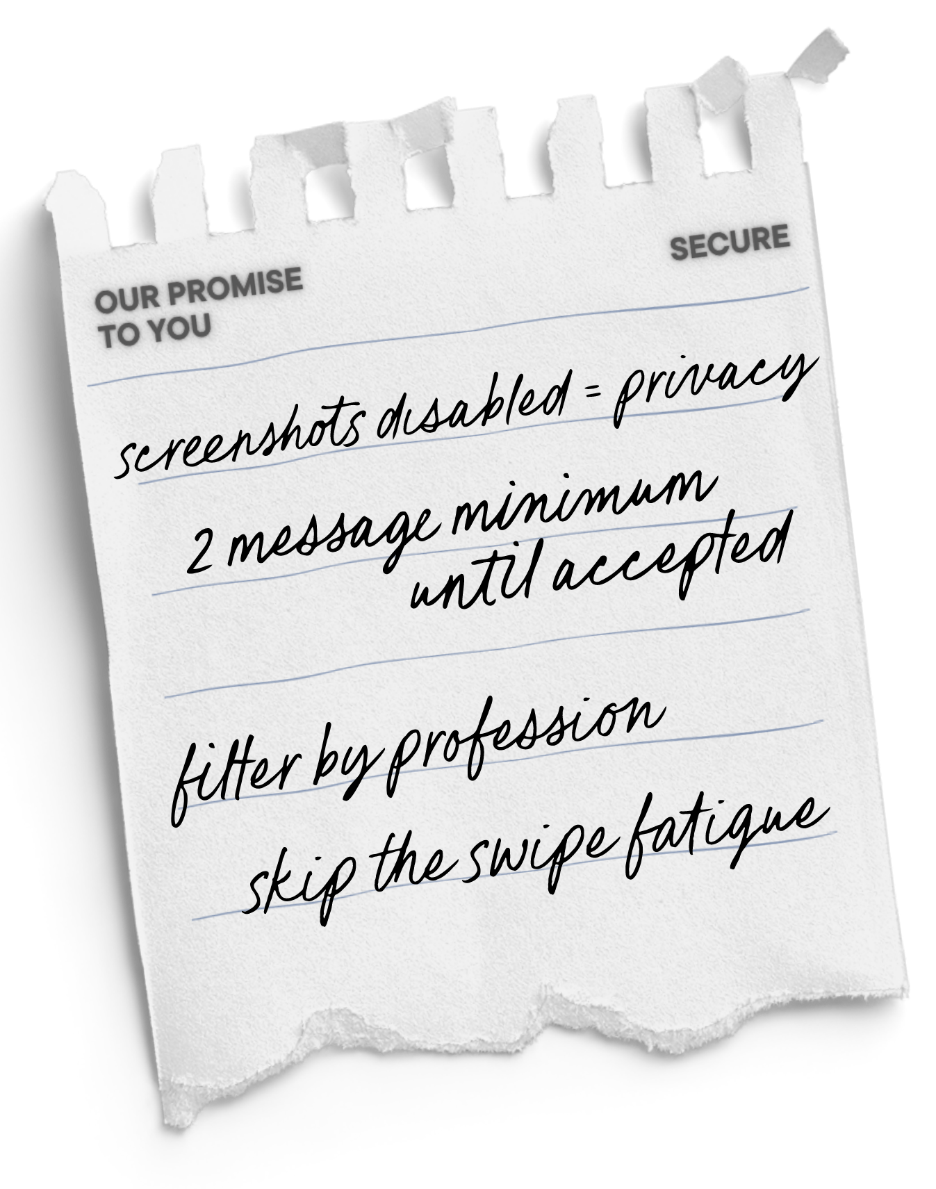 What happens here stays here. Profiles can’t be screenshotted or recorded, because your face, job, and info aren’t content.